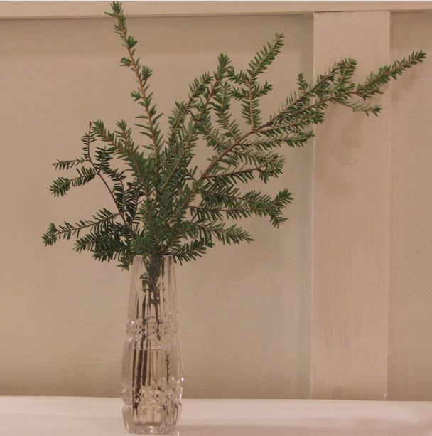 Downstairs bathroom crystal bud vase and fresh pine greens.